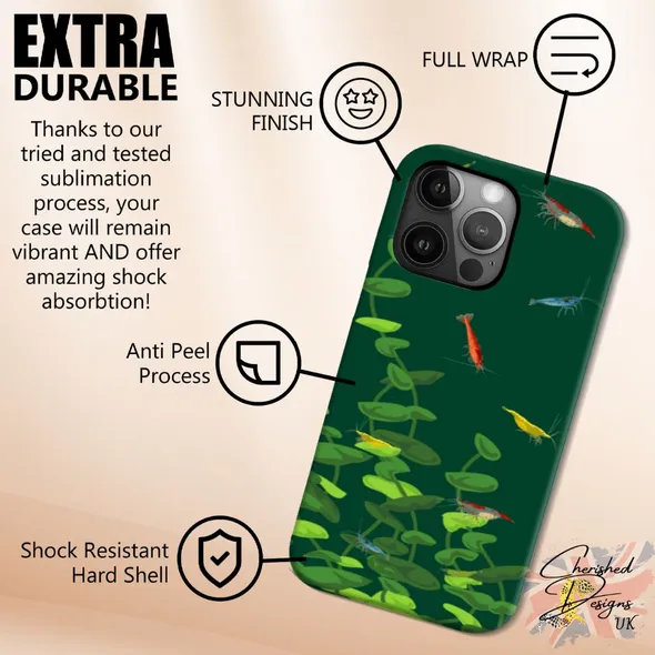 WELCOME TO CHERISHED DESIGNS UK … THANK YOU FOR CHECKING OUT OUR ITEMThis Neocaridina Shrimp phone case is sure to prove really popular just like the decorative pillows and waterproof mats. Emerald green has been named as the top colour trend for 2022 so you can be bang up to date with your phone accessory.**PLEASE NOTE: These cases are not mass produced cheap imported thin plastic easy crack cases but of durable quality , these are manufactured in the UK, designed by Cherished Designs UK and only 1000 are produced making them a unique statement for your phone.