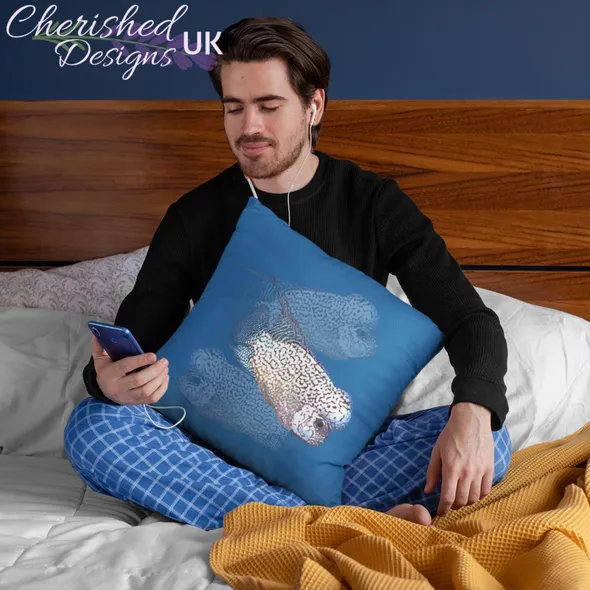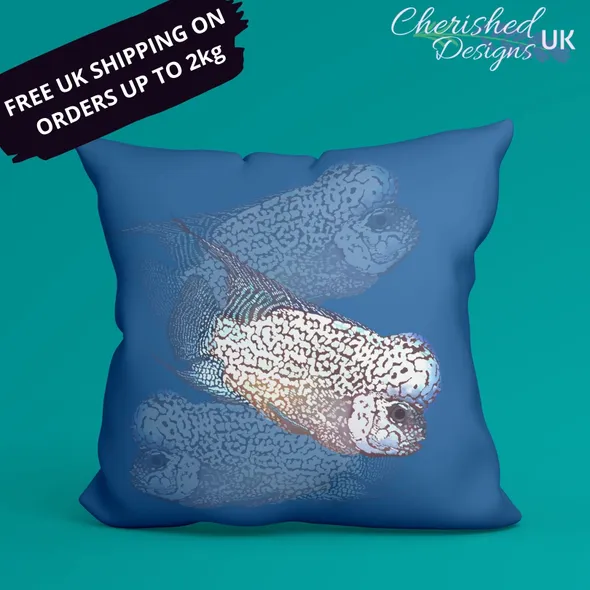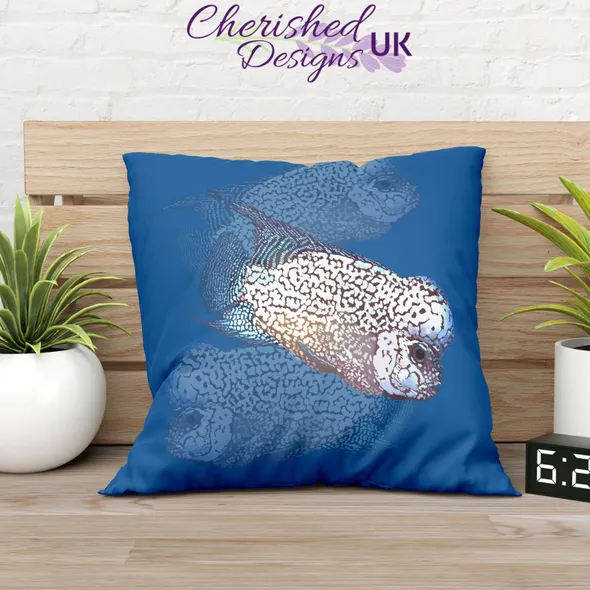 WELCOME TO CHERISHED DESIGNS UK … THANK YOU FOR CHECKING OUT OUR ITEM This stunning Flowerhorn cichlid fish drawn by our Designer DeeDee is sure to catch the eye of any Flowerhorn lover. A hint of metallic shades against a deep maroon body is just one of the reasons why Flowerhorn keepers are so obsessed with them. Also available as a desk gaming/mouse mat and canvas print we think this is the perfect gift especially as it's blue tones are so on trend this year! They are available in 30x30 cm (12"x12") … 45x45 cm (18"x18") and 60x60 cm (24"x24") sizes (please note the largest size is huge as stated by our customers!) Our cushions come with or without the plump inners... if you choose to have your cushions with an inner you will be pleased to know they are made from 100% hygienic faux fibre filling to give a plump yet luxurious feel, they conform to BS 5852 UK fire safety regulations. All our zips are sewn using an invisible style to provide a clean look and easy care provision. Our cushion covers can be fully machined washed without fear of the gorgeous image fading.