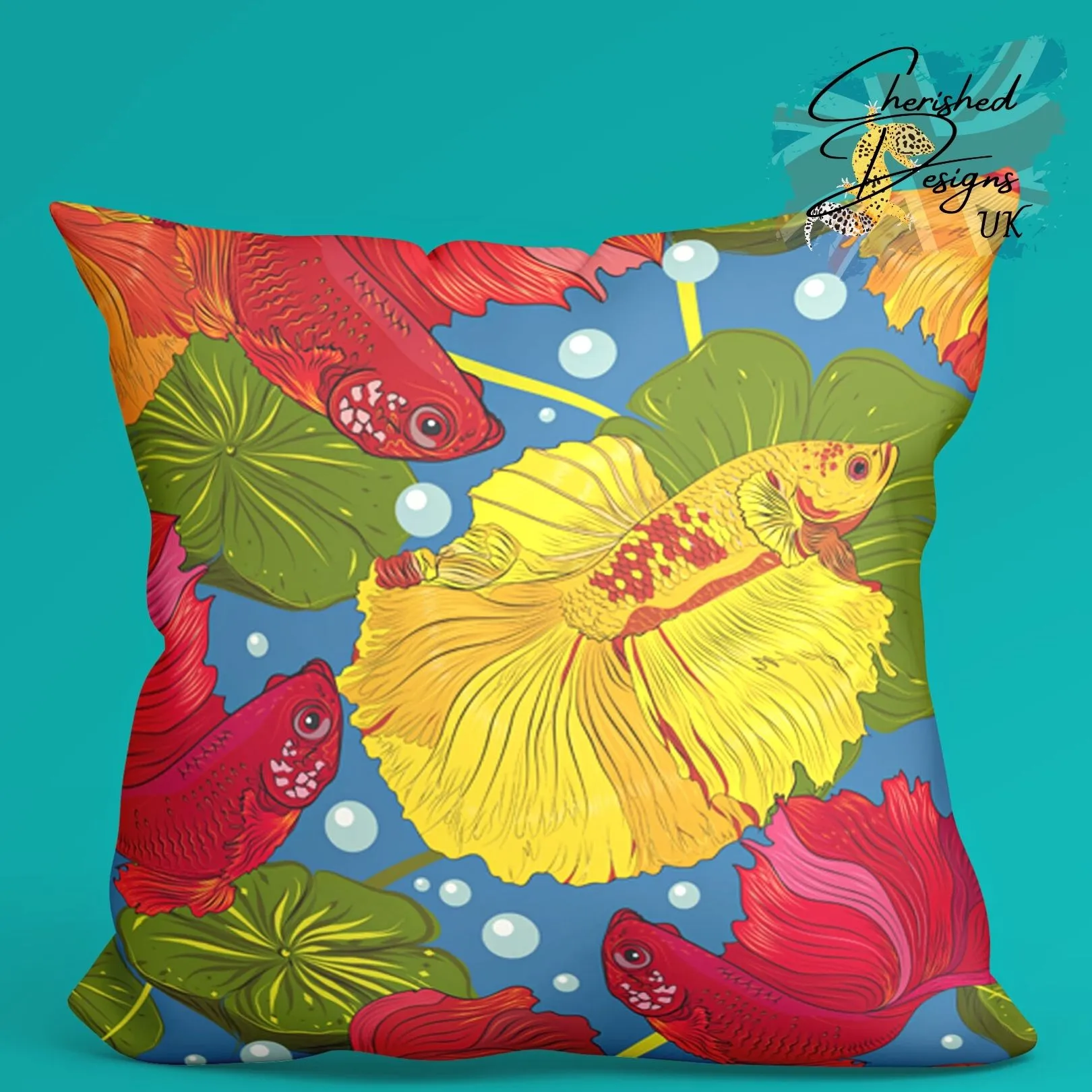 WELCOME TO CHERISHED DESIGNS UK … THANK YOU FOR CHECKING OUT OUR ITEM This stunning Flowerhorn cichlid fish drawn by our Designer DeeDee is sure to catch the eye of any Flowerhorn lover. A hint of metallic shades against a deep maroon body is just one of the reasons why Flowerhorn keepers are so obsessed with them. Also available as a desk gaming/mouse mat and canvas print we think this is the perfect gift especially as it's blue tones are so on trend this year! They are available in 30x30 cm (12"x12") … 45x45 cm (18"x18") and 60x60 cm (24"x24") sizes (please note the largest size is huge as stated by our customers!) Our cushions come with or without the plump inners... if you choose to have your cushions with an inner you will be pleased to know they are made from 100% hygienic faux fibre filling to give a plump yet luxurious feel, they conform to BS 5852 UK fire safety regulations. All our zips are sewn using an invisible style to provide a clean look and easy care provision. Our cushion covers can be fully machined washed without fear of the gorgeous image fading.