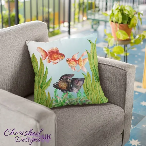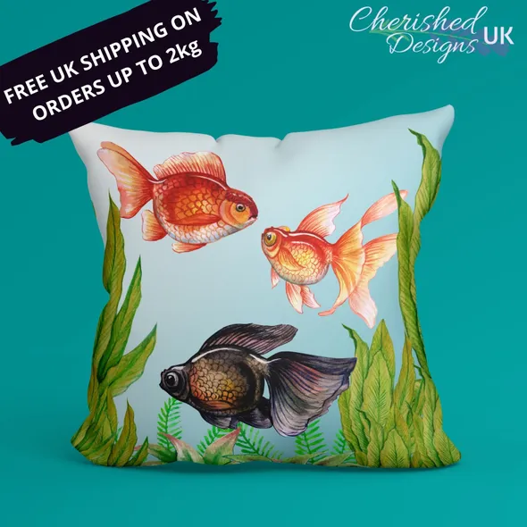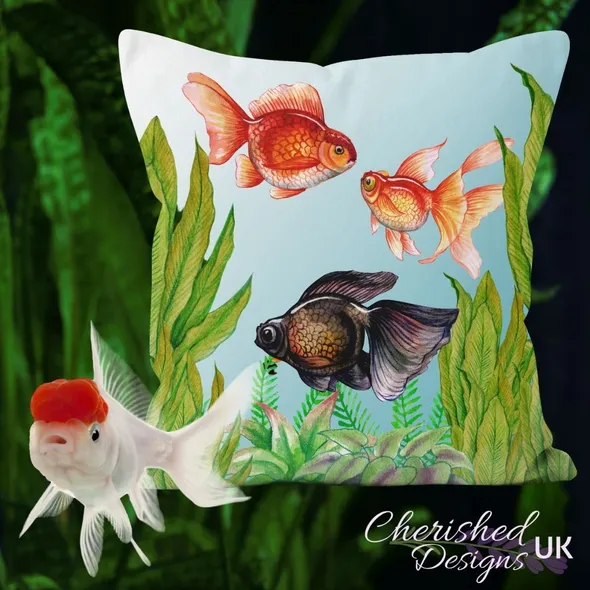 WELCOME TO CHERISHED DESIGNS UK … THANK YOU FOR CHECKING OUT OUR ITEM This striking Limited Edition Fancy Goldfish cushion is the perfect gift for fish lovers. Fancy Goldfish have been amongst the most popular of fish for many years with their vibrant colours and flowing fins giving them an elegance we admire. They are available in 30x30 cm (12"x12") … 45x45 cm (18"x18") and 60x60 cm (24"x24") sizes (please note the largest size is huge as stated by our customers!) Our cushions come with or without the plump inners... if you choose to have your cushions with an inner you will be pleased to know they are made from 100% hygienic faux fibre filling to give a plump yet luxurious feel, they conform to BS 5852 UK fire safety regulations. All our zips are sewn using an invisible style to provide a clean look and easy care provision. Our cushion covers can be fully machined washed without fear of the gorgeous image fading.